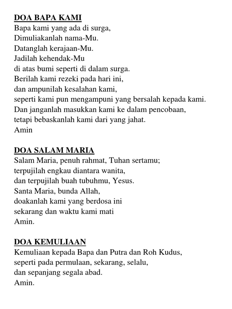 Amin doa aku percaya.bapa kami.salam maria 3 kali.terpujilah doa ini disadur dari: